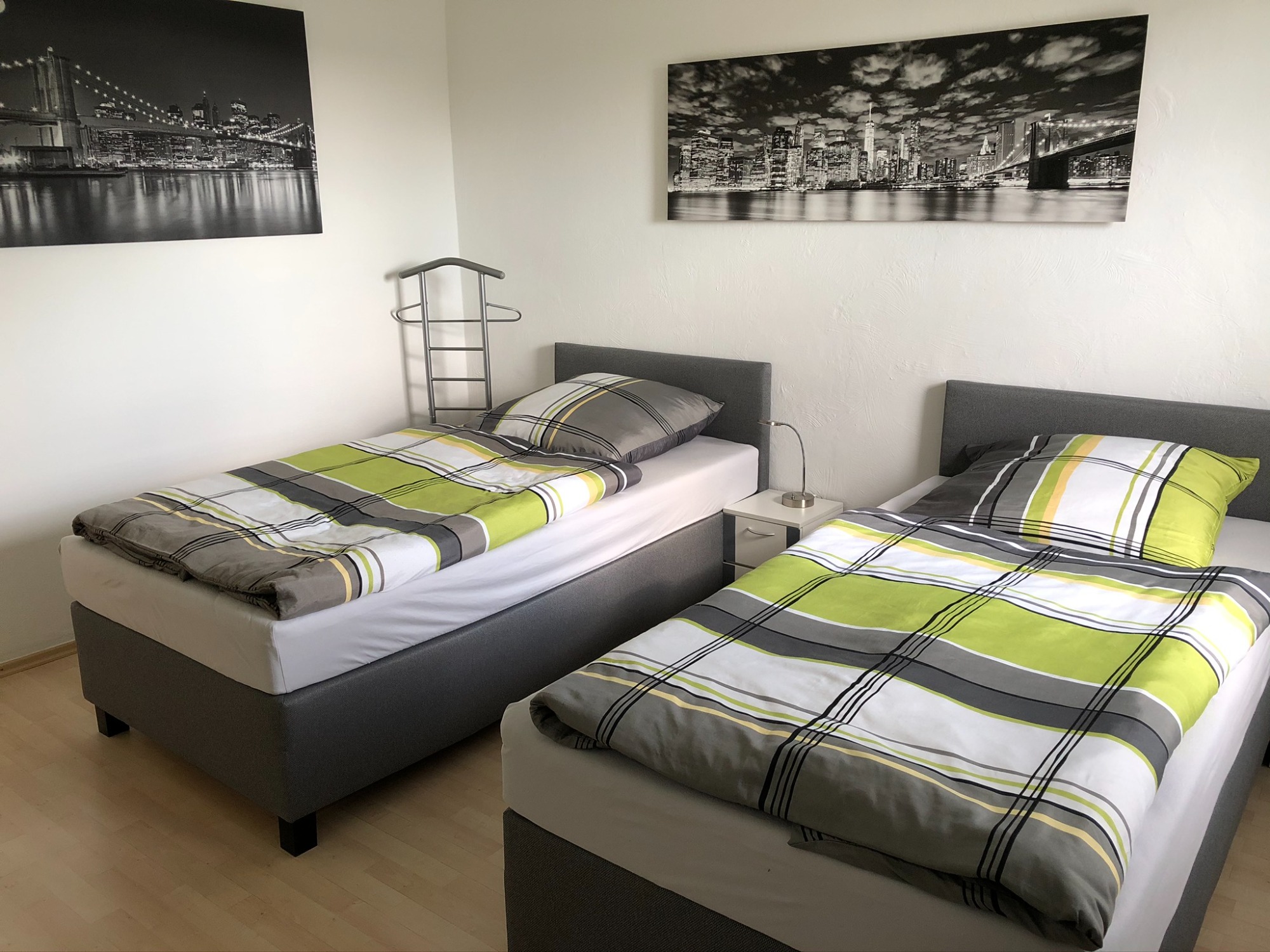 Separates Schlafzimmer mit zwei Boxspring-Einzelbetten (je 100 cm breit, bei Bedarf zusammenschiebbar)